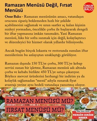 Onur Balcı - Ramazan menüsünün amacı, vatandaşın orucunu sipariş beklemeden hızlı bir şekilde açabilmesini sağlamak ve uzun saatler aç kalan kişinin mideyi yormadan, öncelikle çorba ile başlayarak dengeli bir iftar yapmasına imkân tanımaktı. Yani Ramazan menüsü, lüks bir sofra sunmak için değil, kolaylaştırıcı ve düzenleyici bir hizmet olarak yıllardır biliniyordu.