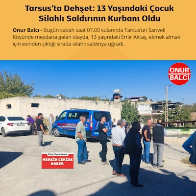 Onur Balcı – Bugün sabah saat 07.00 sularında Tarsus’un Sarıveli Köyünde meydana gelen olayda, 13 yaşındaki Emir Aktaş, ekmek almak için evinden çıktığı sırada silahlı saldırıya uğradı.