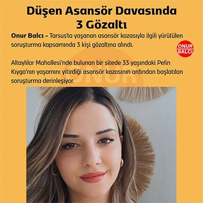 Tarsus ilçesinde yaşanan asansör kazasıyla ilgili yürütülen soruşturma kapsamında 3 kişi gözaltına alındı. Altaylılar Mahallesi’nde bulunan bir sitede 33 yaşındaki Pelin Kıyga’nın yaşamını yitirdiği asansör kazasının ardından başlatılan soruşturma derinleşiyor.